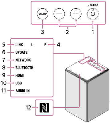 PAIRING- Druk hierop om de luidspreker in- of uit te schakelen (stand-bystand).