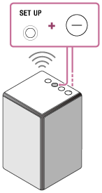 - När högtalaren är ansluten till ett Wi-Fi-nätverk (LINK-indikatorn lyser orange) slår du på högtalaren och håller sedan --knappen (volym) och SET UP-knappen intryckta.