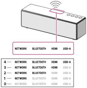 Indikatorerne for funktionerne (NETWORK, BLUETOOTH, HDMI, USB-A) på toppanelet begynder at lyse.
