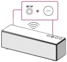 - Mens høyttaleren er koblet til et Wi-Fi-nettverk (LINK-indikatoren tennes med en oransje farge), slå på høyttaleren, og trykk og hold deretter - (volum)-knappen og SET UP-knappen.