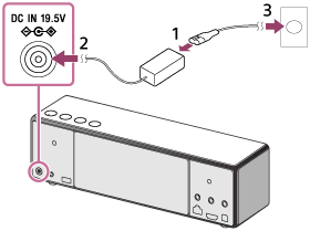 - Anslut nätadaptern till DC IN 19.5V-uttaget på högtalaren.