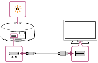Anslut DC IN-porten sändaren och USB-porten på tv:n med den medföljande USB Type-C®-kabeln.