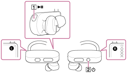 插图显示的是右耳机戴在右侧,左耳机戴在左侧时的情况。未佩戴时,左右可能会交换。