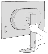 När du bär monitorn, med baksidan av monitorn vänd mot dig, håll den övre delen av stativet med ena handen och botten av stativet med den andra handen.