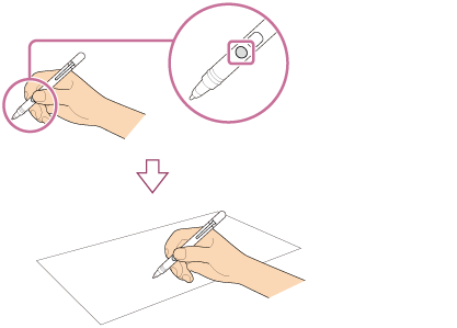 ペンの上側のボタンを押しながら、タッチパネルにペンを近付けて希望の位置に軽く押しつけながらなぞります。
