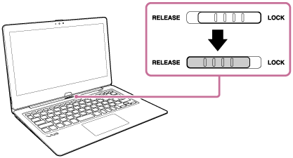 ビューモードにしたら、ディスプレイをキーボード側に回転させて、ディスプレイロックスイッチをRELEASE側からLOCK側にずらしてください。