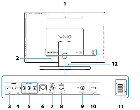 Descreve os recursos na parte de trás do computador VAIO, como portas de conexão.