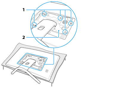 Irrota seitsemän ruuvia (1) ristipääruuvimeisselillä ja irrota jalusta (2) tietokoneesta.