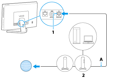 Kytke lähiverkkokaapeli (A) (myydään erikseen) VAIO-tietokoneen