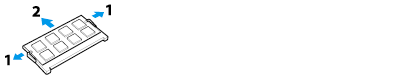 При отсутствии свободного гнезда извлеките один из установленных модулей памяти. Потяните задвижки по направлению стрелок, чтобы извлечь модуль под углом (1), а затем потяните модуль в обратном направлении (2).