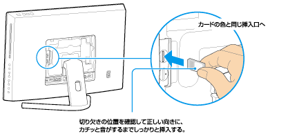 青いカード を上段青の挿入口(スグつくTV)に、赤いカードを下段赤の挿入口(PCアプリ)に挿入します。