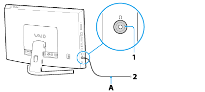(ヘッドホン)端子(1)に音声ケーブル(別売り)(A)をつなぐ。