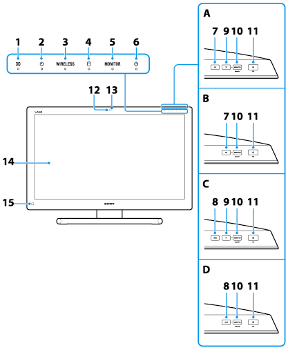 Décrit les fonctionnalités sur la partie frontale de l'ordinateur VAIO, telles que les boutons et les témoins.