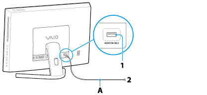 Conecte um dispositivo USB (2) à porta USB MONITOR ONLY (APENAS MONITOR) (1) com um cabo USB (não fornecido) (A).