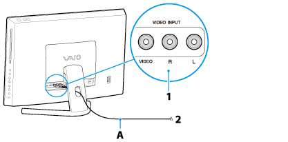 Conecte um cabo AV (A) (não fornecido) à conexão de VIDEO INPUT (ENTRADA VÍDEO) (1) do computador VAIO.