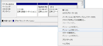 C:ドライブを右クリックして、[ボリュームの縮小]を選択する。