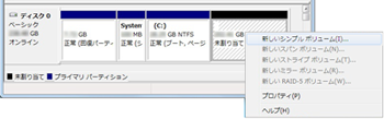 「未割り当て」を右クリックし、[新しいシンプル ボリューム]を選択する。