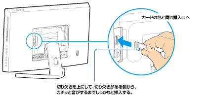 青いカード を上段青の挿入口(スグつくTV)に、赤いカードを下段赤の挿入口(PCアプリ)に挿入します。