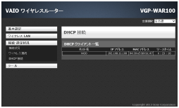 本製品がルーターとして動作しているときに、本製品に接続している機器の名前、割り当てられたIPアドレス、MACアドレス、IPアドレスのリースタイムの残り時間を確認することができます。