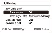 - Si [Mode ECO] est réglé sur [ECO] ou si [Mode de veille] pour [Utilisateur] est réglé sur [Bas], vous ne pouvez plus utiliser les fonctions de contrôle du réseau pendant le mode de veille. Si vous effectuez un contrôle externe via les réseaux et des fonctions de contrôle du réseau, etc., ne sélectionnez pas [ECO] ou ne réglez pas [Mode de veille] pour [Utilisateur] sur [Bas].