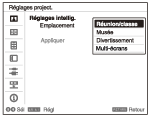 Vous pouvez optimiser les réglages de la qualité d’image, les réglages de l’éclairage et le refroidissement du système (vitesse du ventilateur) en choisissant simplement un emplacement qui correspond à l’environnement dans lequel le projecteur est utilisé. [Réglages intellig.] aide le projecteur à conserver un fonctionnement stable pendant une période prolongée.
