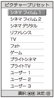 メニュー画面で項目を選び、ポップアップメニュー、設定メニュー、調整メニューを表示します。リモコンのRESETボタンを押すと、選択した項目のみお買い上げ時の値に戻ります。