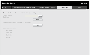 - [Generate self issued certificate (for test only)]: viene installato il certificato generato nel proiettore (certificato generato automaticamente). Fare clic su [Apply] per installarlo.