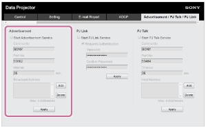 - [Advertisement / PJ Link / PJ Talk]タブをクリックし、[Advertisement / PJ Link / PJ Talk]ページを開く。