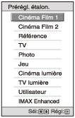 Sélectionnez l’élément souhaité dans la fenêtre de menu pour afficher le menu contextuel, le menu de réglage ou le menu d’ajustement. Appuyez sur la touche RESET de la télécommande pour ne réinitialiser que l’élément sélectionné à sa valeur d’usine préréglée.