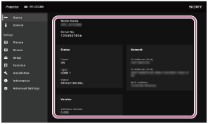 Controllare lo stato corrente del proiettore nella pagina [Status] facendo clic sul pulsante di selezione delle pagine [Status].