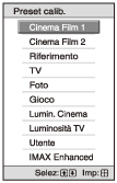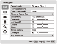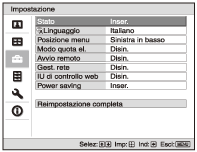 Selezionare la voce desiderata nella finestra del menu per visualizzare il menu a comparsa, il menu di impostazione o il menu di regolazione. Premere il pulsante RESET sul telecomando per ripristinare solo la voce selezionata al valore preimpostato in fabbrica.