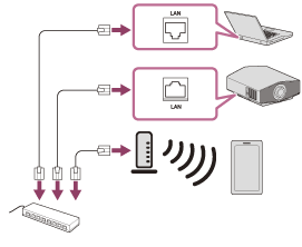 Collegare il proiettore e lo smartphone/computer a un hub o router con cavi LAN (ben stesi) (non in dotazione) o connetterli via Wi-Fi.