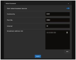 È possibile modificare le impostazioni del protocollo di controllo di Advertisement sulla pagina [Advertisement] in [Advanced Settings].