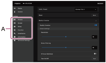 - [Information]: visualizza informazioni come il nome del modello, il numero di serie, il tipo di segnale e il formato del segnale dell’immagine proiettata, la versione del software e il tempo di utilizzo della luce.